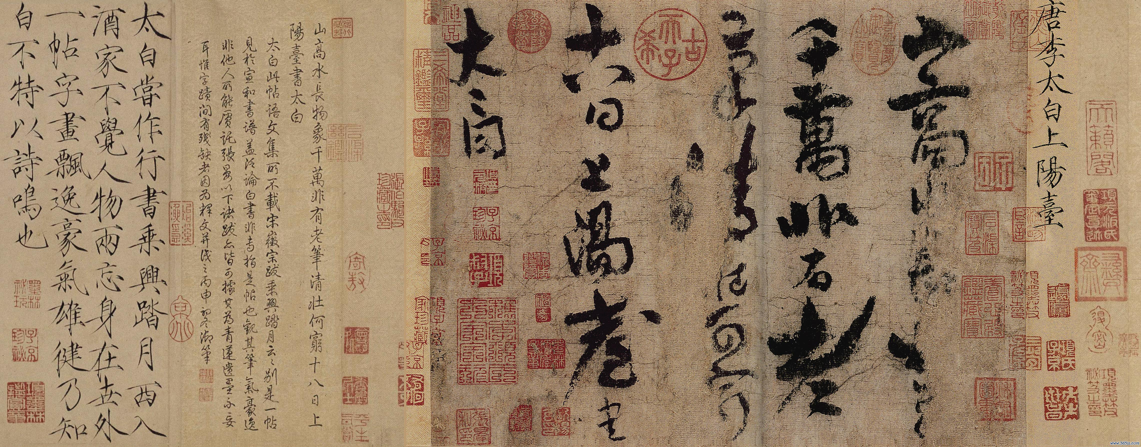 《上阳台帖》为李白自书四言诗,全文仅二十五字,此帖历经宋徽宗与诸多历代鉴藏家递藏。卷首有宋徽宗瘦金体亲题“唐李太白上阳台”,乾隆天子亦在引首亲笔写下“青莲逸翰”四字,足见对其严防有加。《上阳台帖》卷后,还附有宋徽宗、元张晏、欧阳玄、王馀庆、危素、驺鲁以及乾隆天子等东谈主的后记,自北宋以来流传有序,是现有独一的李白法书墨宝,启功先生称此帖“笔迹磊落”,梳理“它的流传过程,是百里挑一可考的”,因此推奖其为“肉迹”,称见其字犹如见到李白本东谈主。